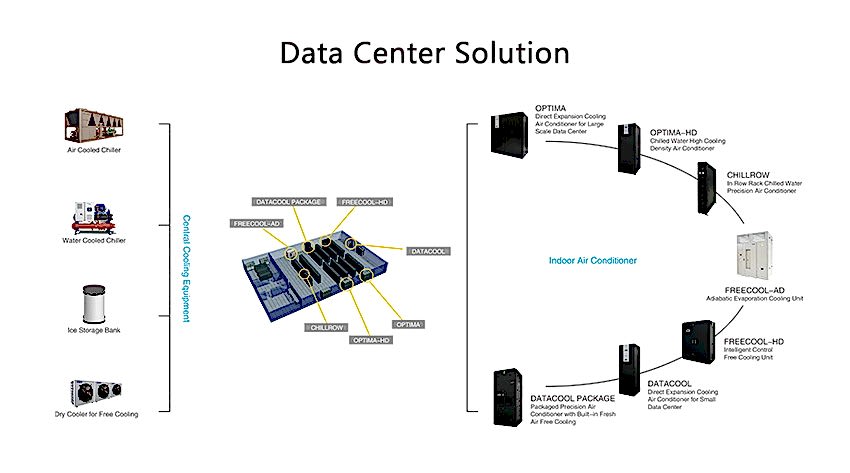 Sıralı, raflı ve adyabatik soğutma çözümleri dahil olmak üzere geniş bir bilgisayar odası klimaları portföyü.